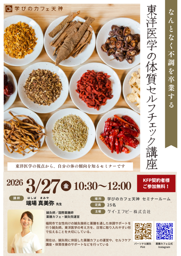 病院に行くほどではないけれど、 「なんとなく疲れやすい」 「冷えやすい」 「眠りが浅い」 「気分が落ち込みやすい」 そんなはっきりしない不調を感じていませんか? このセミナーでは、 その「なんとなく不調」を、東洋医学の視点からやさしく読み解いていきます。 「年齢のせいかな」「体質だから仕方ない」と我慢してきた不調も、 自分の体の傾向を知ることで、整え方が見えてくることがあります。 ▪ 東洋医学の基本的な考え方 ▪ 今の自分の状態がわかる体質(タイプ)のセルフチェック ▪ 体質に合った、今日からできる日常ケアのヒント を、専門知識がなくてもわかりやすくお伝えします。 日々の不調と上手につきあうために、 東洋医学の視点から、自分の体の傾向を知るセミナーです。