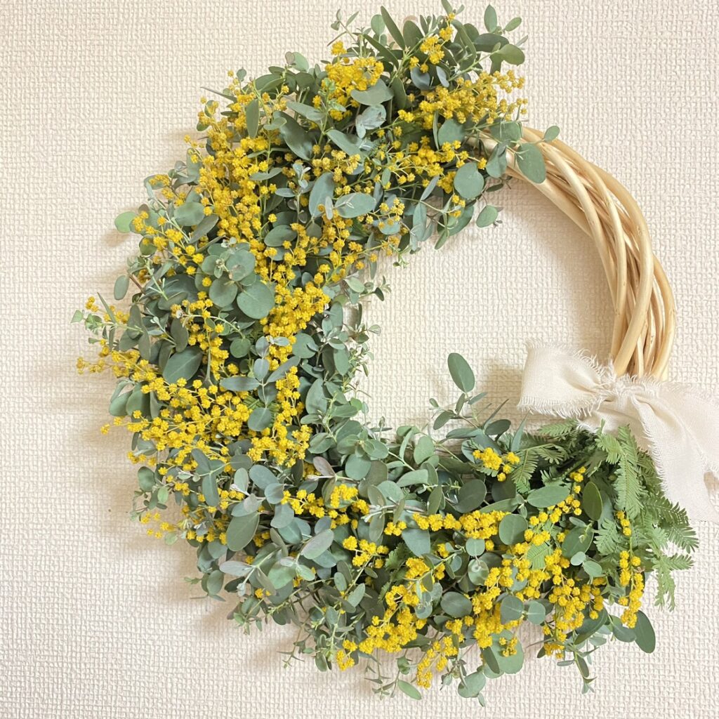 そんなミモザと爽やかな薫りがするユーカリで作ったリースを飾って、春を感じませんか?