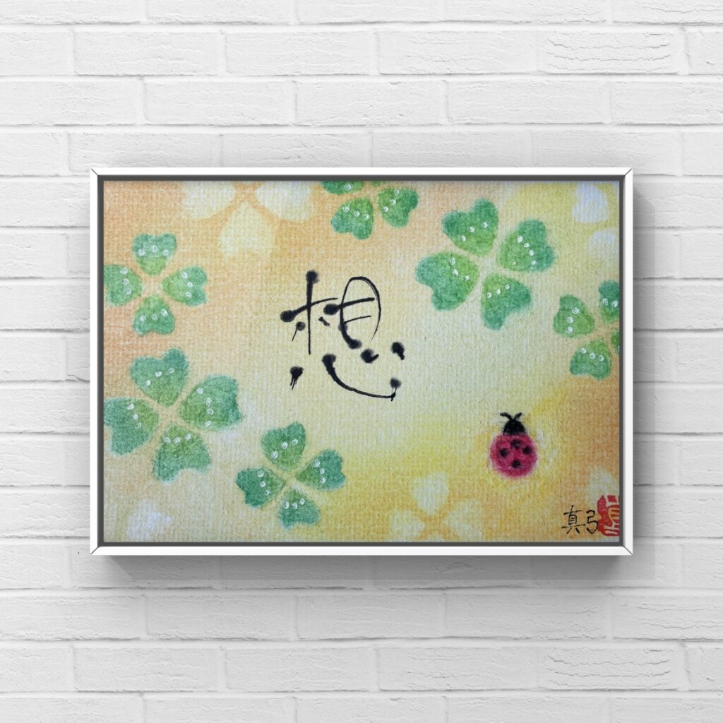 笑顔になる癒しのパステリア書『四つ葉クローバー🍀&てんとう虫』 にじみ文字の『インテリア書』と、優しい色合いの『パステルアート』が組み合わさった大人気のアートです!受付中