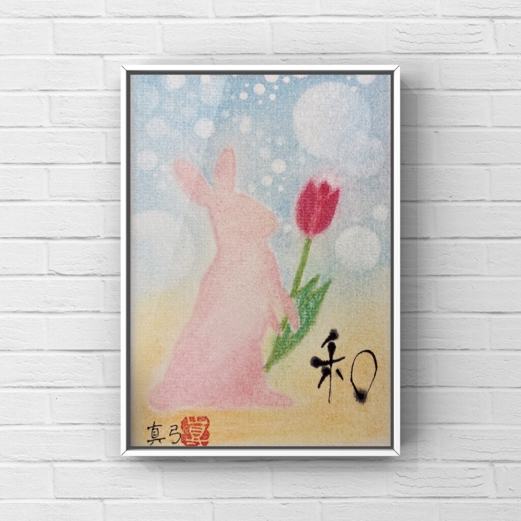 笑顔になる癒しのパステリア書『~チューリップ🌷とうさぎ🐰~』 にじみ文字の『インテリア書』と、優しい色合いの『パステルアート』が組み合わさった大人気のアートです!受付中